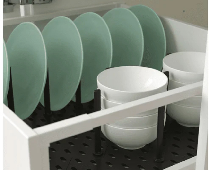 This drawer organizer features 24 adjustable pegs, allowing you to customize the layout to fit plates, pots, lids, or food containers. It helps keep drawers neat and organized while making items easy to access. Ideal for efficient kitchen storage and daily use.