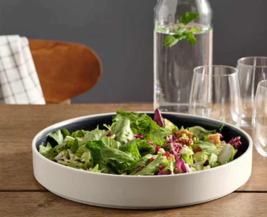 This piece blends minimalist design with rustic materials, creating a timeless yet modern look that stands out in any table setting. Made from a mix of ceramic, glass, and wood, it offers versatility for styling across everyday meals or special occasions. With its generous shape and elegant size, it serves as a beautiful centerpiece and a thoughtful gift option.