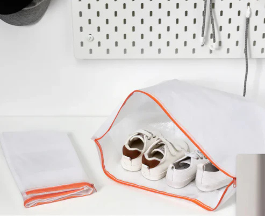 The IKEA Shoe bag, measuring 48×22 cm, is a practical travel accessory featuring a side zipper for easy opening and closing. It is ideal for protecting luggage contents from dirty shoes during trips, and the bag folds completely flat when empty for minimal storage space. As a travel bag for footwear, this product is not designed to be worn or styled.