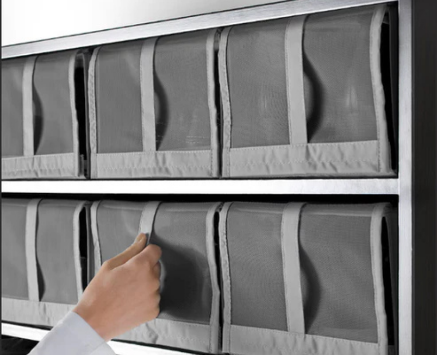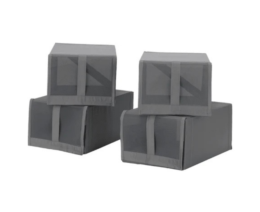 This set of four dark grey shoe boxes measures 22x34x16 cm each and is made from recycled polyester for a more sustainable storage solution. The mesh design allows you to easily see the contents, while the hook and loop fastener provides quick access. When not in use, the boxes can be folded flat for space saving storage and are designed to fit neatly in a 100 cm wide wardrobe frame for efficient organization.