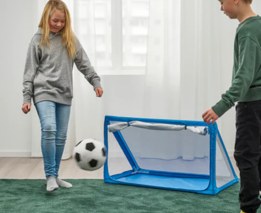 This lightweight ball storage unit doubles as a playful goal, allowing a living room to be quickly transformed into an active play space. One side rolls up for easy access, while the structure can be used standing or on its side depending on need. It is designed to store balls of different sizes and closes securely with touch and close fastening when not in use, encouraging active play and easy cleanup.