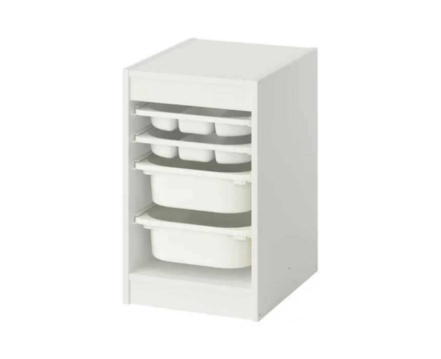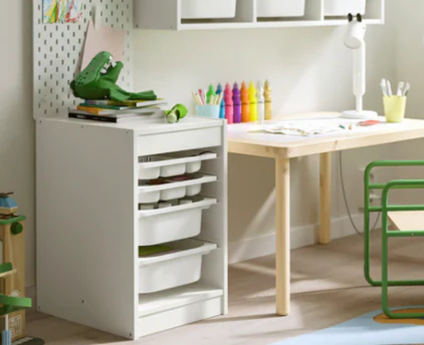This storage solution is designed to help children organise their belongings with ease, featuring low shelves for easy access. It can be used with trays and plastic boxes in various ways, such as under a desk or as a bedside unit. Compartments in the trays support learning to keep items in order and can store small objects like pens, beads, or toys, with optional lids available for added protection.