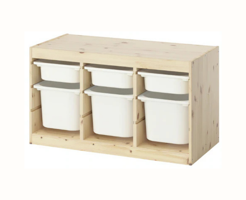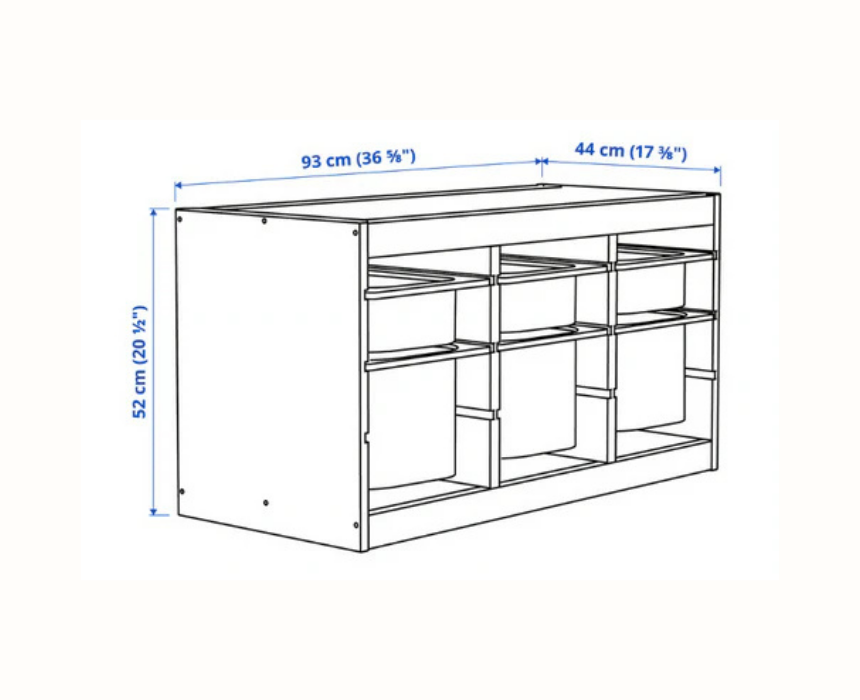 This TROFAST storage combination with boxes offers a practical and sturdy solution for organizing toys and everyday items in children’s rooms or play areas. Measuring 93x44x52 cm, it features a durable frame with easy to slide boxes that help keep belongings neatly sorted and accessible. Its low height design allows children to independently store and retrieve their items.