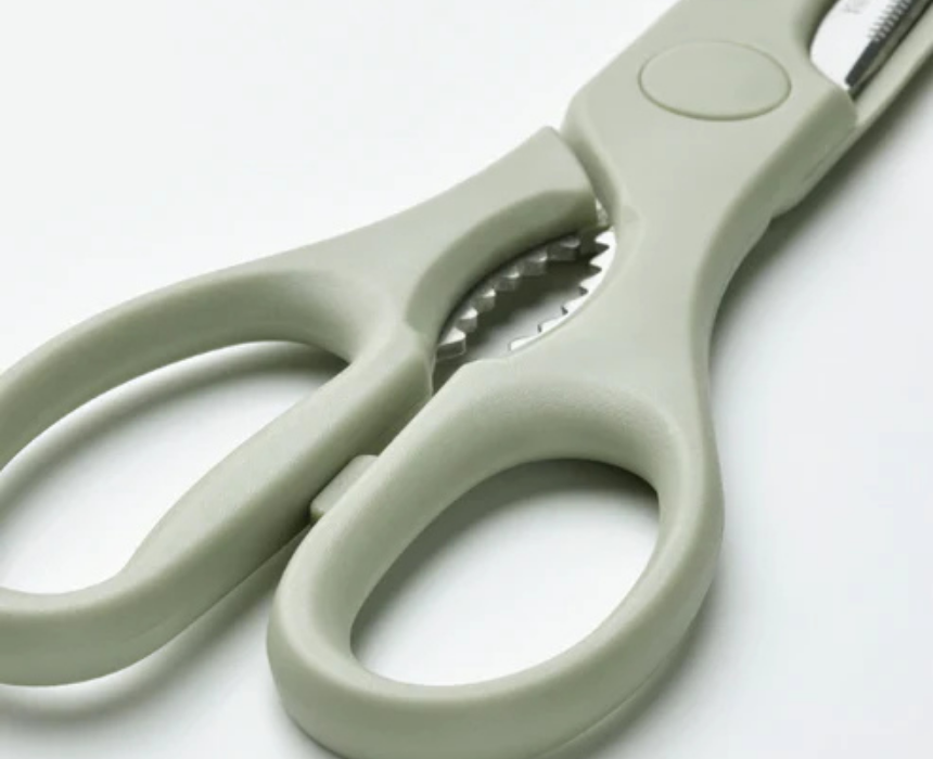 This multi function kitchen scissors is made of stainless steel and designed to make everyday cooking tasks easier and more efficient. It can be used for cutting herbs like oregano, slicing vegetables, and even opening bottles using the built in teeth in the handle. Durable and dishwasher safe, it is a practical all in one tool for kitchen use.