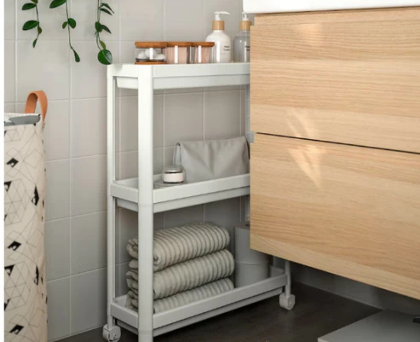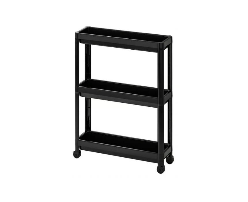This compact trolley is easy to assemble without tools and features a sturdy design with four castors for effortless mobility. High edges on the shelves keep items like shampoo, conditioner, and sponges securely in place. Its small size makes it perfect for organizing and maximizing space in a bathroom.