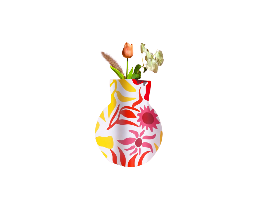 This dynamic paper vase cover bursts with color through large abstract floral designs, creating a cheerful focal point for any room. Printed on 160 gsm recycled paper, it includes an empty glass bottle for effortless display. Style it with fresh flowers or dried stems on a table, shelf, or console to instantly brighten your decor.