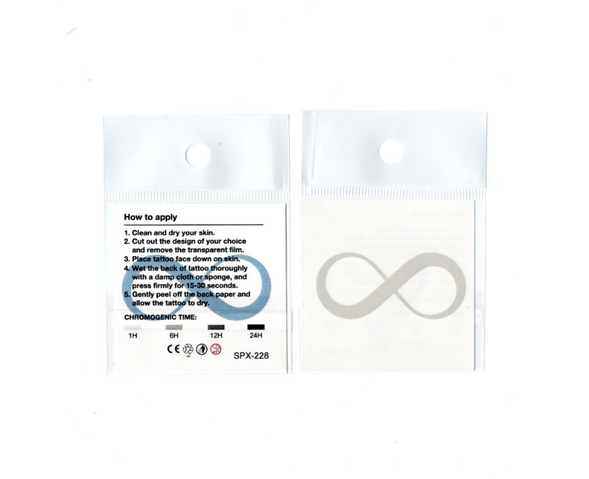5 x 5 cm Jagua Tattoo with infinite symbol design. 100% organic and Halal, FDA, CSPIA, RoHS certified. Apply on clean shaved skin with a wet cloth for 15–30 seconds. Full color develops in 24–48 hours.