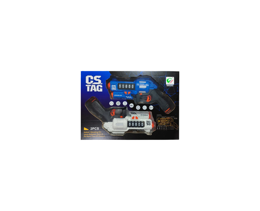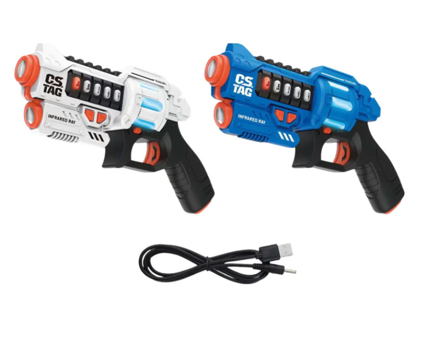 This laser tag play set includes two infrared blasters built for fun and competitive battle games at home or outdoors. Each blaster features an LED score display, dynamic sound effects, bright lights, vibration feedback when hit, and convenient rechargeable power for extended play. Players simply charge the blasters, power them on, and dive into action packed head to head missions.