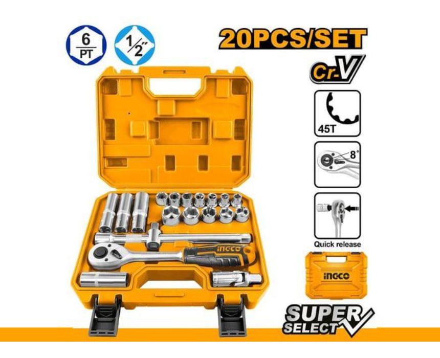 The Ingco 1/2″ Socket Set includes 20 high-quality pieces designed for versatile use. It features a 72-tooth ratchet handle, 12 standard sockets ranging from 10 to 24mm, a 16mm spark plug socket, universal joint, 10-inch extension bar, three-way joint, and three deep hexagonal sockets. Made from durable 50BV30 Cr-V steel with chrome plating and heat treatment, this set offers strength and comfort with its three-color soft handle, packed neatly in a BMC case for easy storage and transport.
