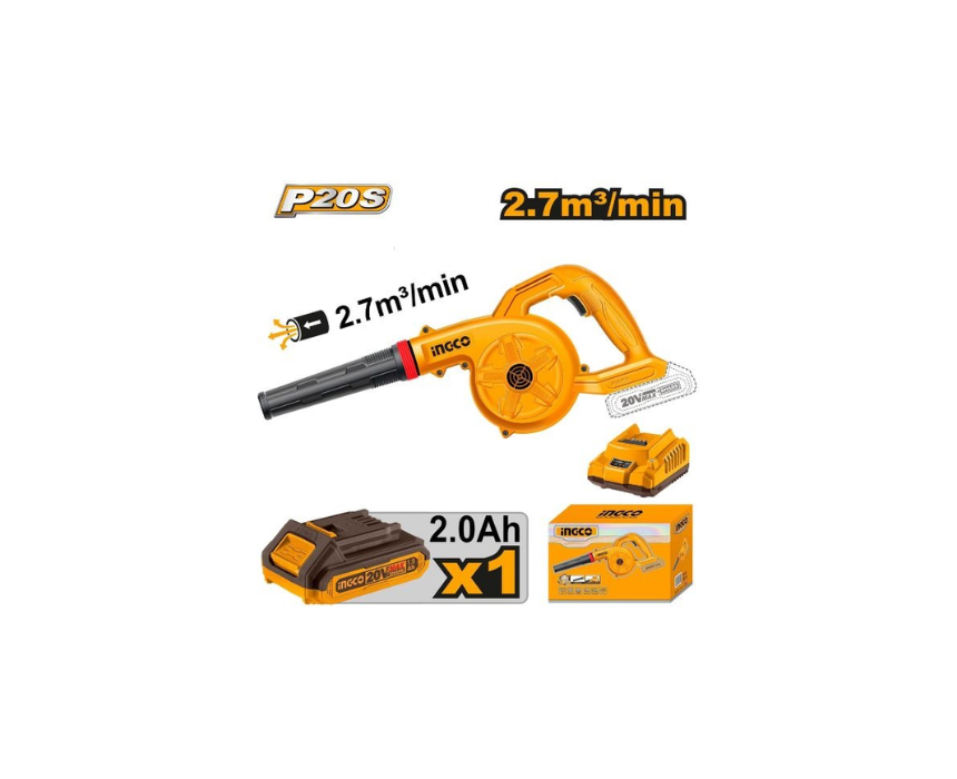The INGCO 20V Blower with Battery and Charger delivers powerful and efficient performance for quick cleaning of dust, leaves, and debris. With a 20V motor reaching 18000rpm and a max air volume of 2.7m³/min, it ensures strong airflow and easy handling. The included 2.0Ah battery and charger provide convenience and portability for both home and professional use.