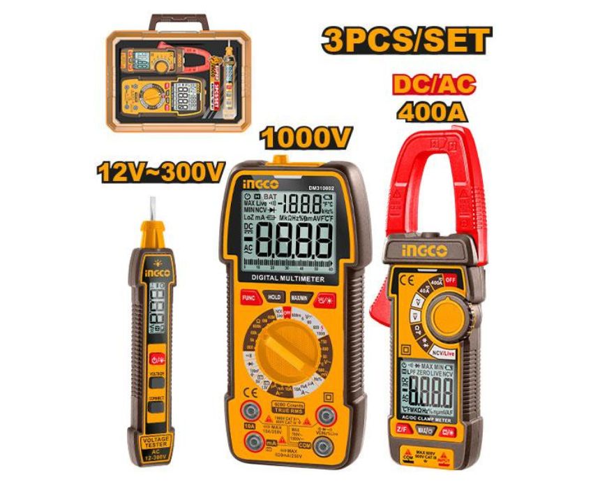 The Ingco Electric Test Kit is a complete solution for electrical diagnostics, featuring a 12-300V digital voltage tester with LCD display and alarm, a 1000V digital multimeter with TRMS 6000 counts, and a 400A AC/DC clamp meter with TRMS 4000 counts. Ideal for professionals and DIY users, it includes all required AAA batteries and comes neatly packed in a plastic box for easy storage and transport.