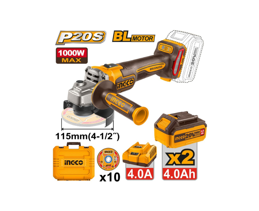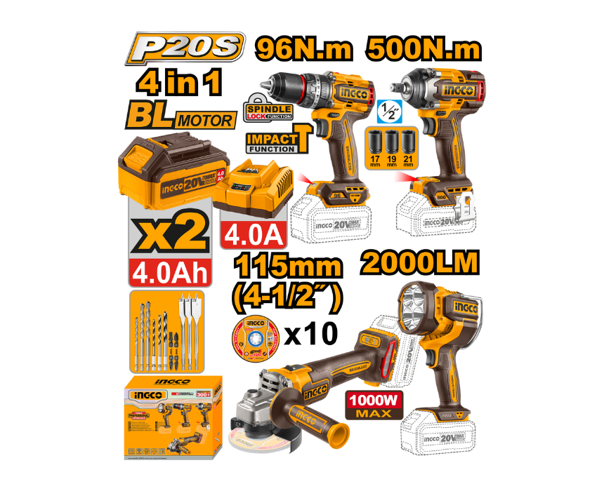 The INGCo 20V 4pcs combo kit includes a compact brushless cordless impact drill with 96NM, a cordless impact wrench with 500NM fastening and 650NM nut busting power, a 1000W cordless angle grinder, and a 2000-lumen cordless work light. The set comes with 2 4A batteries, a super fast 4A charger, and essential accessories including drill bits, cutting discs, and impact sockets, perfect for DIY projects, home improvement, or professional use. Lightweight and cordless, it offers easy handling and versatile use for any job.