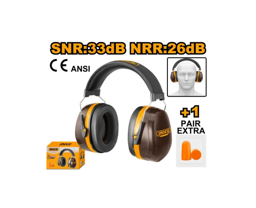 The INGCO industrial earmuffs provide superior hearing protection with a double-shell ABS design, SNR 33dB, NRR 26dB, and come with an extra pair of earplugs rated SNR 38dB, NRR 32dB. Comfortable with soft headband padding and adjustable stainless steel wire, they ensure a secure fit during loud machinery, lawn mowing, or industrial work. Conforms to ANSI3.19-1974 and EN352-2:2020 standards for reliable safety.
