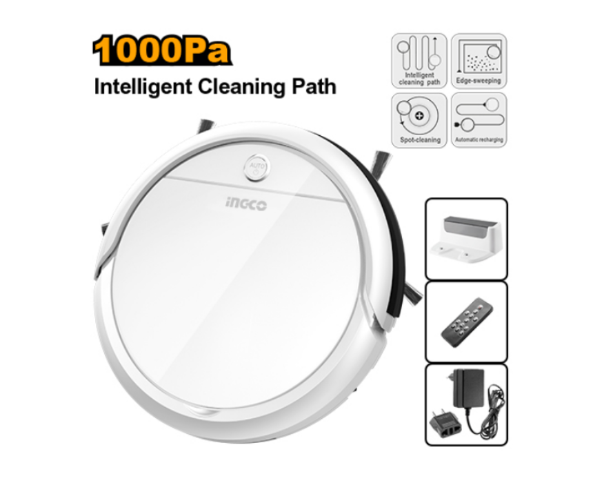 The INGCO Intelligent Robotic Vacuum with Remote offers smart gyroscope navigation for scheduled cleaning routes and edge mode for wall-following precision. With 700-1000Pa suction, cliff detection, automatic recharge, and 50-70 minutes runtime powered by a 2000mAh battery, it includes 4 side brushes, a main brush, HEPA filter, remote control, and charging base for complete dry cleaning convenience.