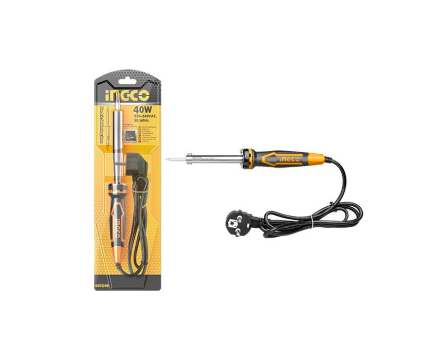 The INGCO 40W soldering iron delivers reliable performance with a high-quality, long-lasting replaceable tip. Operating at 220-240V, it heats up in 3–5 minutes, making it ideal for precise electrical work and DIY projects. Featuring a straight tip head and support stand, it ensures comfort, accuracy, and durability for both professional and home use.