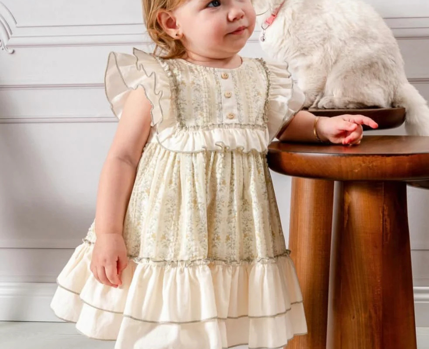 This ivory ruffle dress for ages 9 months to 3 years offers a soft, comfortable fit with a delicate design perfect for everyday wear or special occasions. Its airy fabric and charming ruffle details pair beautifully with simple shoes or light accessories for a polished, playful look. A versatile wardrobe piece, it adds elegance and style to any young child’s outfit.