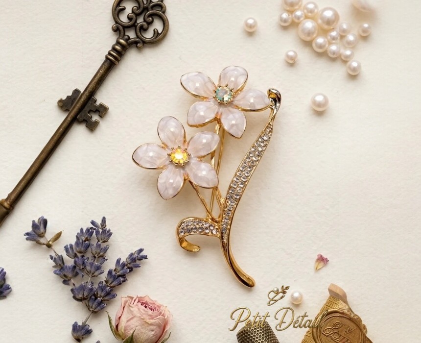 A graceful statement brooch designed to bring softness, elegance, and shine to your outfit. This floral brooch features two ivory-toned blossoms, sparkling crystal details, and a polished gold-tone finish for a refined feminine look.