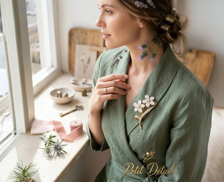 Its elongated shape makes it perfect for styling on blazers, shirts, dresses, jackets, scarves, knitwear, and bags.
