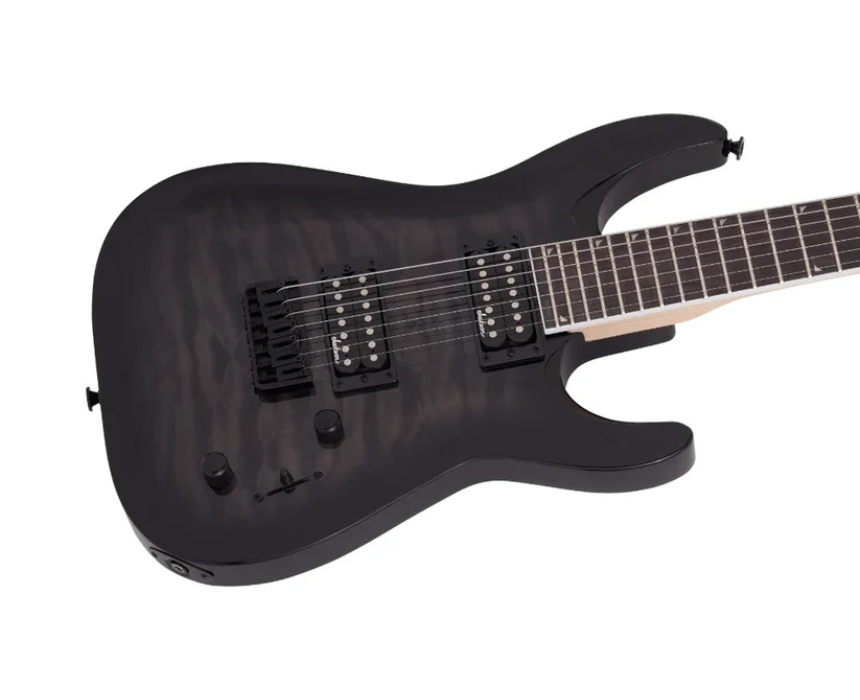 The Jackson JS Series Dinky Arch Top JS32Q DKA HT electric guitar features a poplar body with a quilt maple arched top, bolt-on maple speed neck with graphite reinforcement, bound amaranth fingerboard, 12 to 16 compound radius, and 24 jumbo frets for fast, stable playability. Dual Jackson high-output ceramic humbuckers, three-way blade selector, volume and tone controls, HT6 string-through hardtail bridge, and sealed die-cast tuners deliver powerful tone and reliable sustain. Its transparent burst finishes with black hardware style perfectly with modern rock and metal stage setups.
