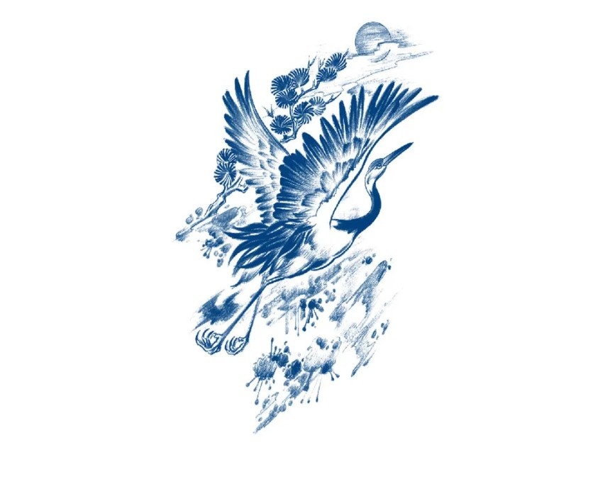 This temporary jagua tattoo features an elegant Japanese crane bird design sized 11 x 18 cm, inspired by traditional symbolic body art. It applies easily to the skin and develops into a natural dark stain, creating a realistic tattoo effect that lasts for several days. Ideal for styling on arms, shoulders, or back, it adds a refined and artistic touch to festival outfits, cultural looks, and everyday fashion.