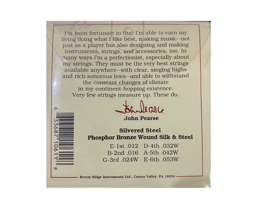 The John Pearse Acoustic Guitar Phosphor Bronze Silks Lt/Med 12-53 strings combine phosphor bronze with silk for a warm, smooth tone and comfortable playability. Featuring a hex core and round wound design, they provide consistent tension and rich resonance across all six strings. Ideal for acoustic guitarists seeking balanced sound and expressive performance.