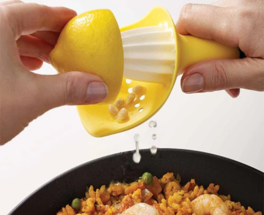 The Joseph Joseph Catcher Citrus Reamer with Seed Catcher in yellow makes juicing lemons, limes, and oranges easy and mess-free. Its integrated seed catcher prevents seeds from falling into juice, and it can be styled on a countertop or stored in drawers for a bright, functional kitchen accessory.