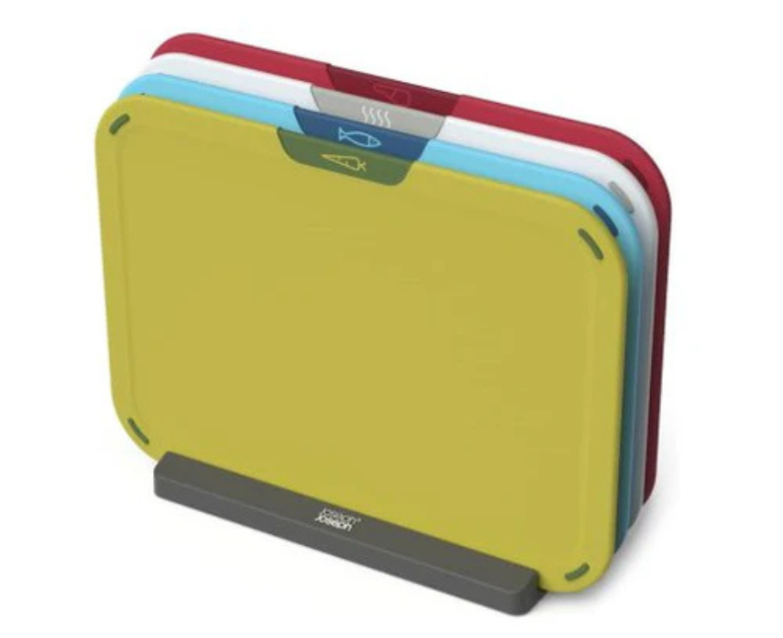 The Joseph Joseph Index 4-Piece Chopping Board Set includes color-coded boards designed to prevent cross-contamination while preparing meat, fish, vegetables, and cooked food. Each board features a compact, space-saving design with easy-grip handles for safe and convenient use. Durable and stylish, the set keeps kitchens organized and hygienic while adding a modern touch to meal prep.