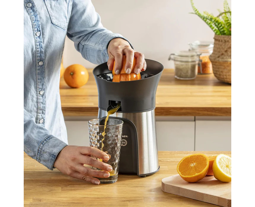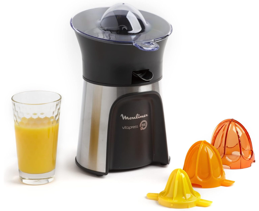 The Moulinex PC603D10 Vita Press Juicer features a powerful 100 W motor and 3 cones suitable for all citrus fruits. Its direct-serve design with metal jacketing, ergonomic glass recess, drip-stop, and lid protector ensures mess-free juicing. Includes a 1 L graduated jug, automatic on/off function, non-slip feet, and cord storage. Quick, efficient, and easy to clean, this juicer delivers fresh, healthy juice in minutes with minimal effort.
