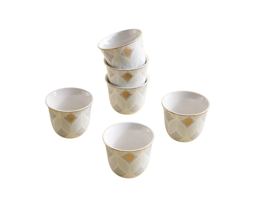 This six piece Kahwa cup set includes cups with a 70 ml capacity, each adorned with a beautiful floral pattern. Crafted from high quality New Bone China, the cups are food safe and freezer safe, combining elegance with practicality. Perfect for serving your favorite Kahwa, they bring a touch of modern luxe style to your tea time.