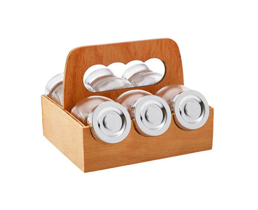 The Karaca Casa 7-Piece Spice Rack Set includes six clear glass jars neatly arranged on a modern wooden tray stand, offering both style and practicality for kitchen organization. The jars are perfect for storing a variety of spices, herbs, or condiments, keeping them accessible while adding a contemporary touch to any countertop or pantry. Its sleek wooden design blends seamlessly with modern and classic kitchen decor.