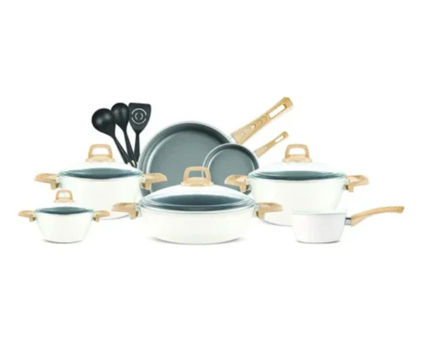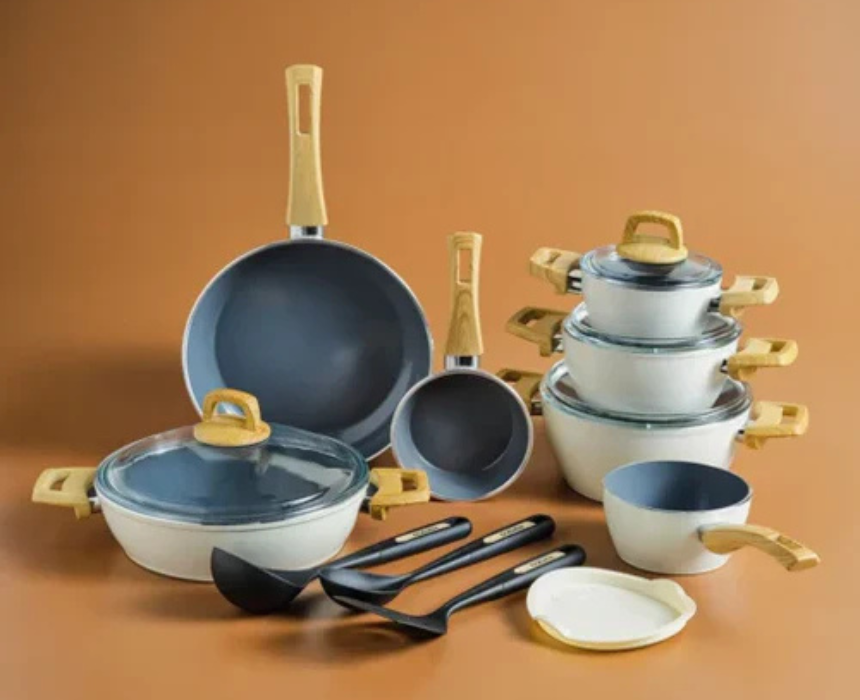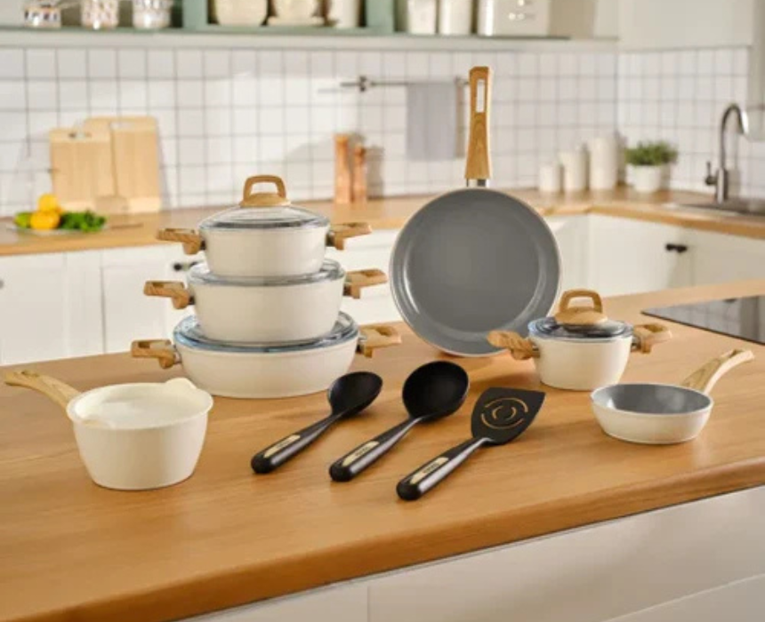The Karaca x Refika Swiss Crystal 15 Piece Cookware Set features PFAS free non stick technology for safe, effortless cooking and easy cleaning, finished in a soft creamy color for a warm kitchen aesthetic. Designed for versatile everyday use, it delivers reliable heat performance while supporting healthier meal preparation. For styling, its neutral creamy tone pairs beautifully with natural wood, pastel, or minimalist kitchen interiors.