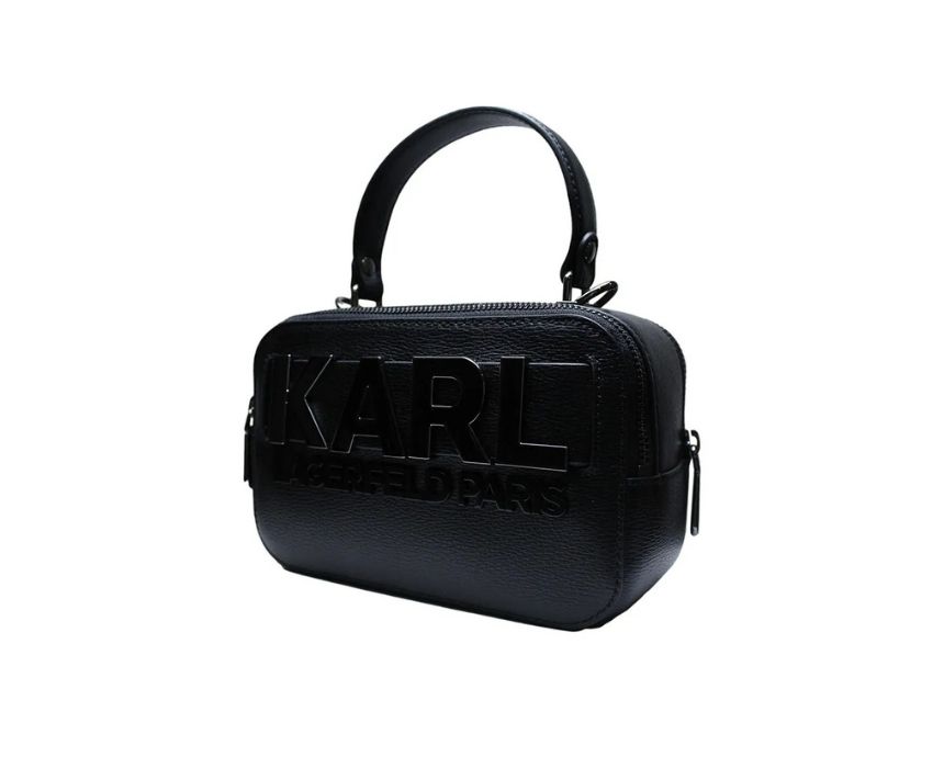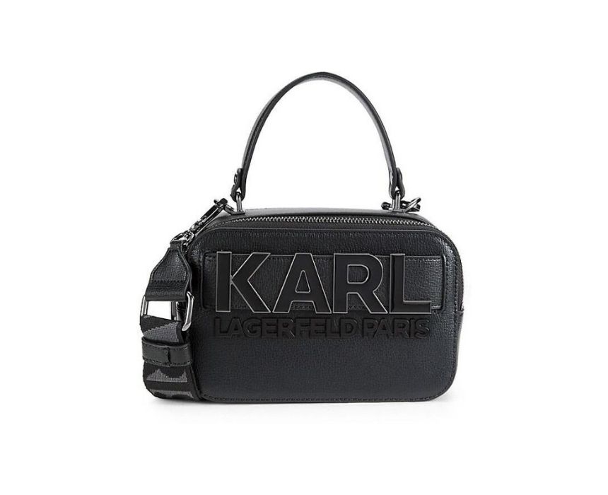 The Karl Lagerfeld Camera Bag in black leather features a structured silhouette with the iconic ‘Karl’ logo on the front, double zip closure, and silvertone hardware for a sleek look. Inside, it offers zip pockets and a lined interior for organization. With a top handle and adjustable shoulder strap, it can be worn as a crossbody or handbag, making it a versatile accessory for both casual and modern chic styles. Its compact size of 7.5″ W x 5″ H x 3.2″ D fits essentials with ease.