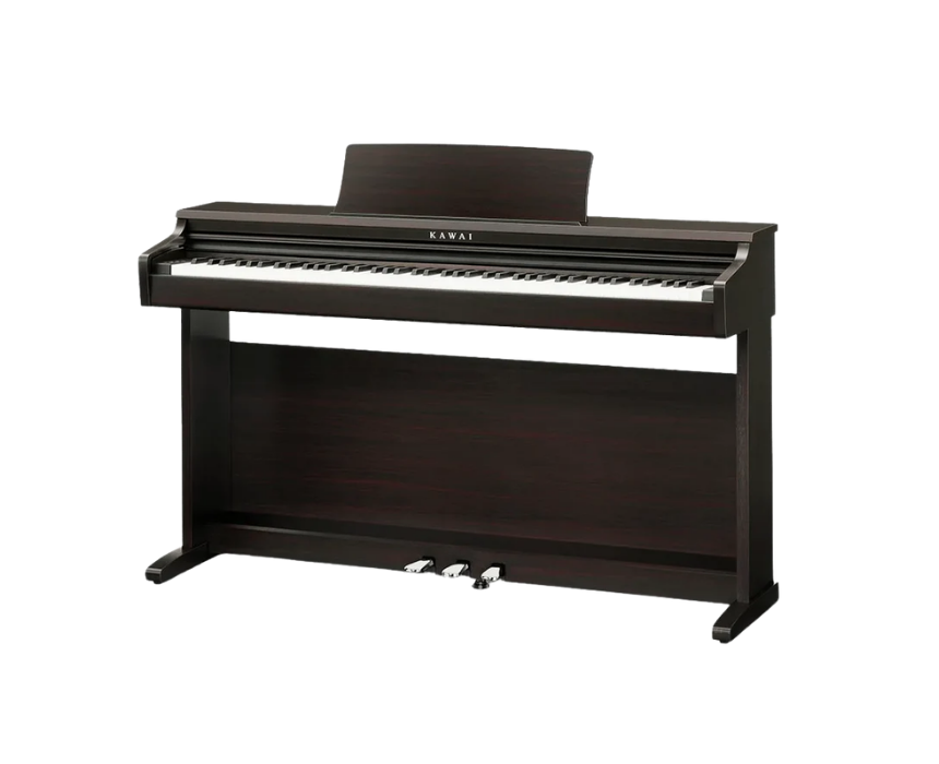 The Kawai KDP120 digital piano offers 88 weighted keys with authentic hammer action, providing a realistic and expressive playing experience for beginners and advanced musicians. It features rich Shigeru Kawai grand piano sounds, multiple voices, reverb options, and built-in lesson songs, while Bluetooth and USB connectivity enable seamless app integration for interactive learning. Designed with a premium cabinet and sliding key cover, it fits elegantly into any home space for practice, performance, or display.