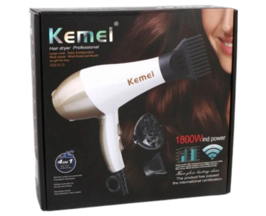 The Kemei KM810 Professional Hair Dryer 1800W delivers powerful and efficient drying with multiple heat and speed settings for salon-quality results at home. Lightweight and ergonomic, it is best used by sectioning hair and styling with the included concentrator nozzle for smooth, frizz-free finishes