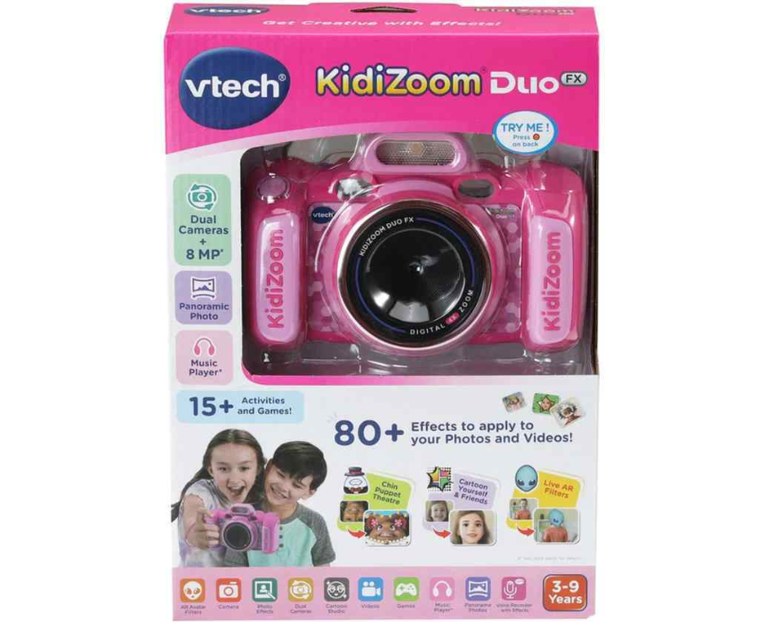 The Kidizoom Educational Toy Photo Camera Duo FX in compact pink is a fun and durable digital camera designed for kids to explore photography and creativity. It features dual lenses for selfies and regular photos, built-in effects and games, and simple controls, making it perfect for home, school, or outdoor adventures. Its lightweight design allows kids to carry it easily or wear it with a strap for hands-free fun.