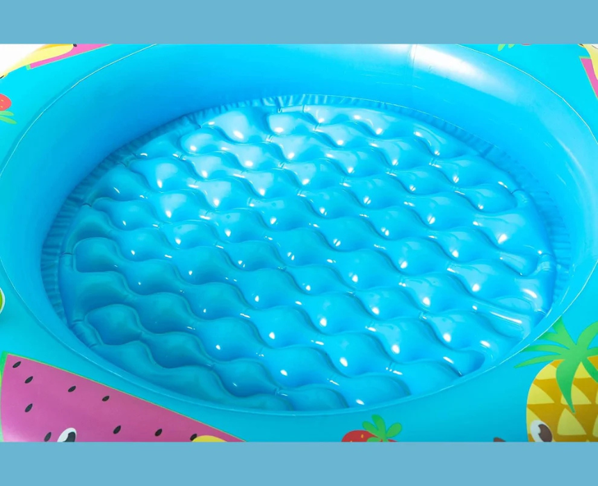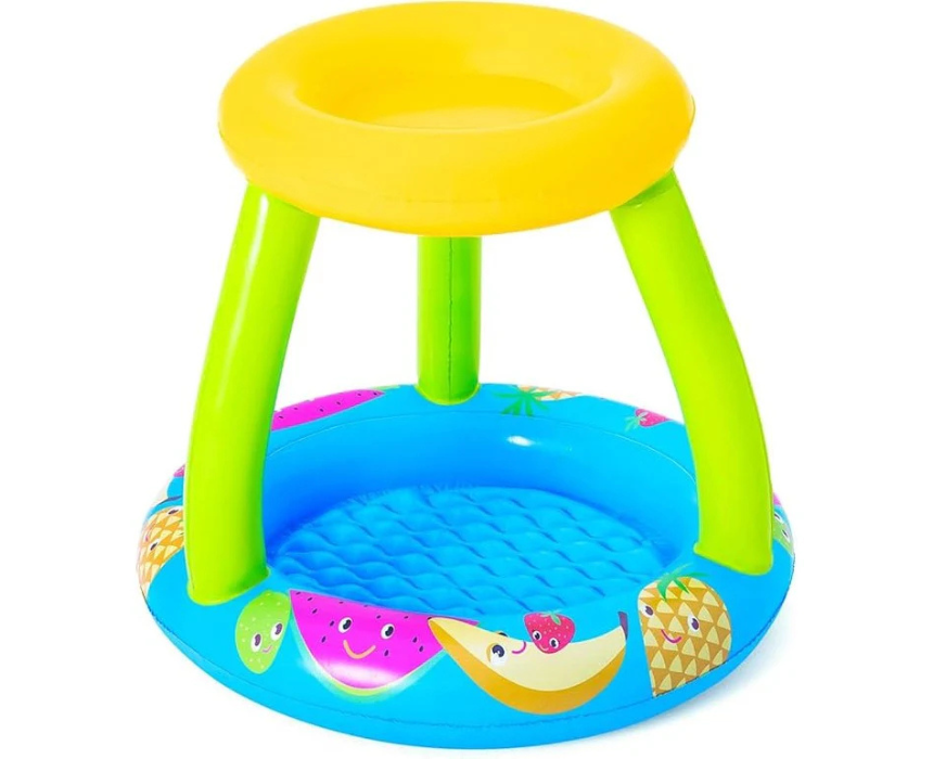 Create a fun and shaded splash zone with this kids play pool featuring a colorful fruit themed canopy for added sun protection. Designed for safe and enjoyable outdoor water play, it offers a soft inflatable structure and shallow space ideal for young children. Pair it with light swimwear, sun hats, and sandals for a cheerful summer look.