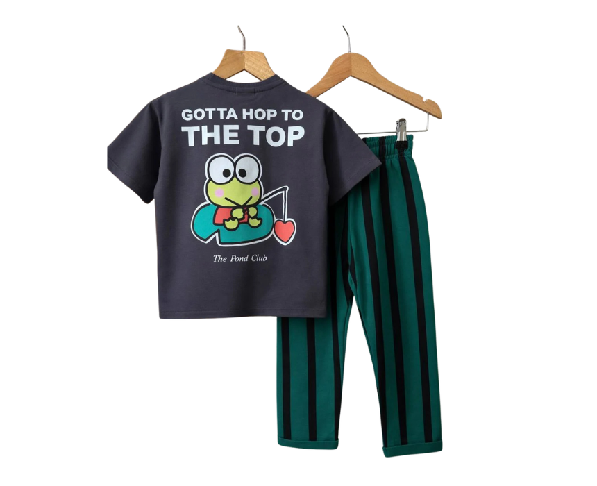This kids club outfit set is made from one hundred percent cotton, providing a soft and breathable feel for everyday comfort. Designed for children aged two to eight years, it offers a relaxed fit that supports easy movement during play or outings. It can be styled with sneakers for a casual look or layered with light outerwear for cooler days