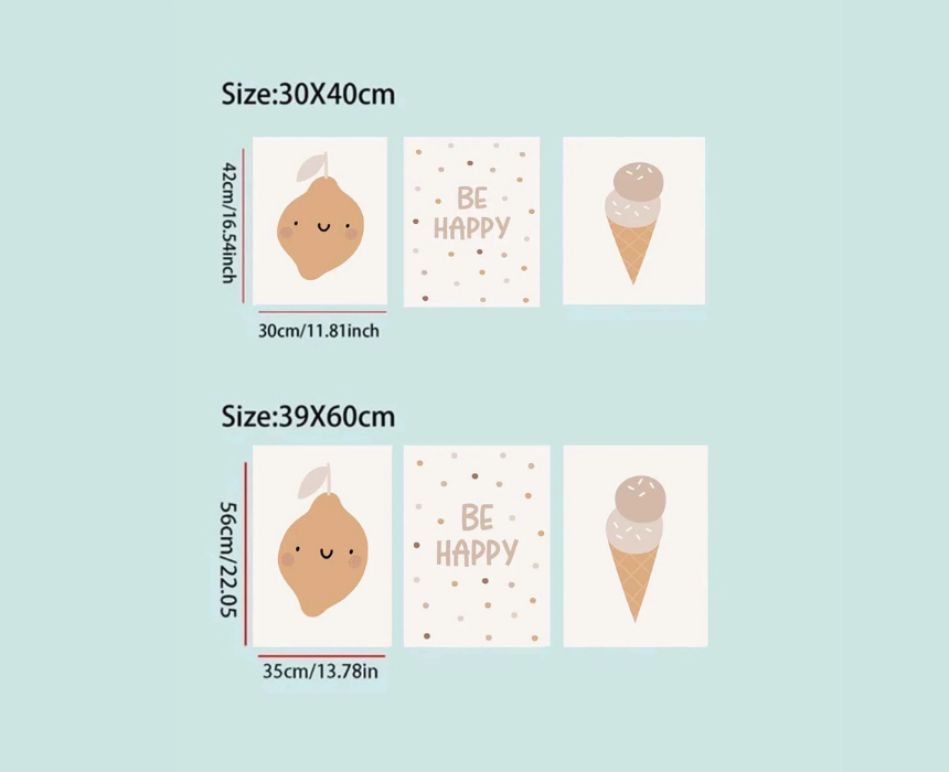 This set of 3 Kids Graphic Wall Canvas Paintings adds a playful and colorful touch to any child’s room. Each canvas measures 30x40cm and can be framed for an additional cost, allowing customization to match the room’s décor. Perfect for bedrooms, playrooms, or as a thoughtful gift for young art lovers.
