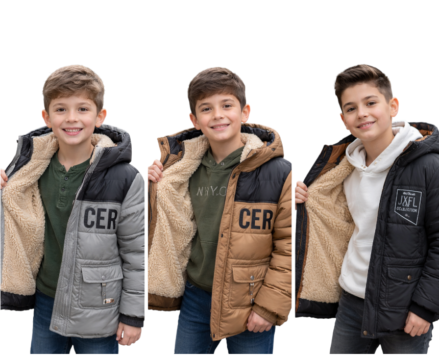 This boys’ jacket is designed with a velour-lined interior for warmth and durability. Available for ages 6 to 12 years in multiple colors ; camel, grey, and black, choose the color selected from photos. Suitable for daily use and outdoor activities.