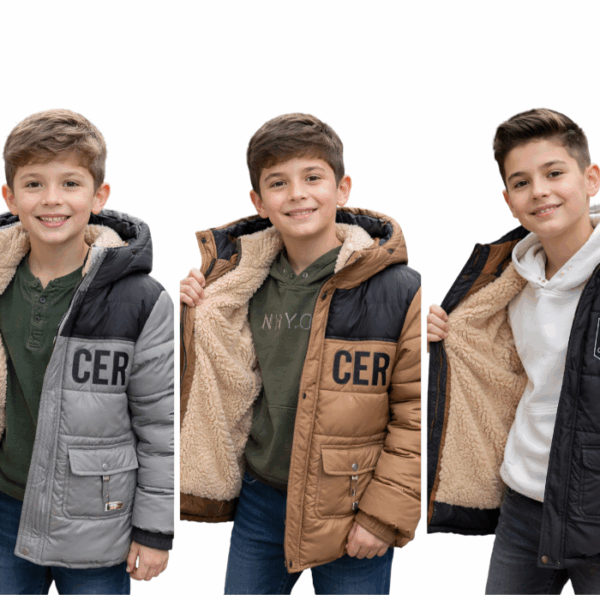 This girls’ jacket features a velour lining for added warmth and comfort. Available for ages 6 to 12 years and offered in pink, blue, and black. Ideal for school and everyday wear during colder seasons.
