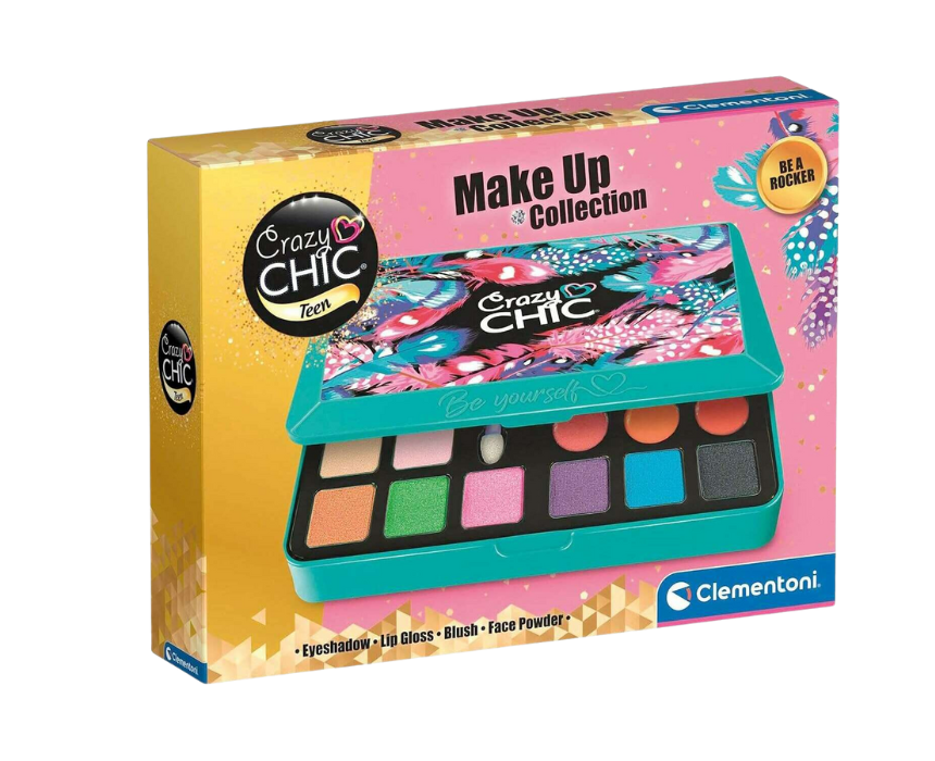 The Crazy Teen Makeup Box is designed for girls aged 8 and up who want to explore the world of makeup safely and creatively. It includes high-quality eyeshadows, glosses, and applicators in a trendy palette with a professional look, encouraging imaginative play and self-expression. Imagined and developed in Italy, this makeup kit combines style, fun, and creativity in one compact box.