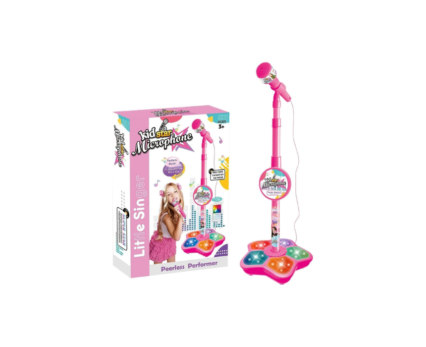 This pink child microphone comes with an adjustable stand up to 100cm, built in lights, a USB cable, and a 3.5mm jack for fun singing sessions. It encourages musical creativity, stage play, and confidence while children enjoy performing at home or on the go. Suitable for ages 3 and up and can be styled with dress up outfits for a complete performance experience.