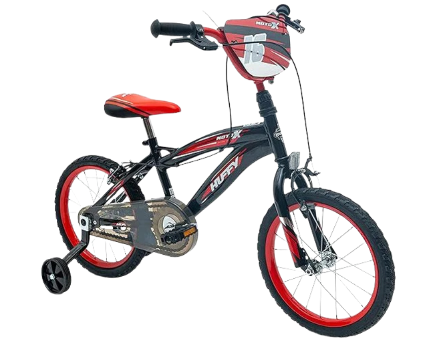 The Huffy 16 inch Moto X bike is designed for young riders, featuring a durable steel frame, motocross inspired styling, and stable training wheels for added confidence while learning. Its easy grip handlebars and comfortable padded seat ensure smooth rides, while the bold design pairs perfectly with sporty outfits and outdoor gear for an adventurous look.