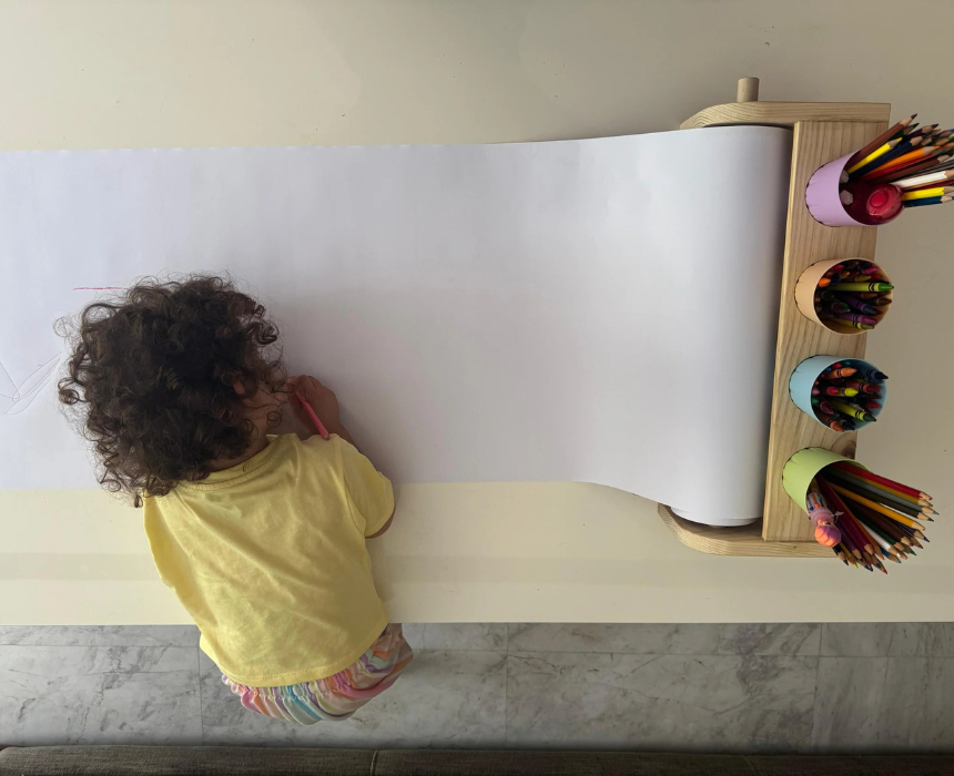 This Kids Paper Roll Stand is a handmade wooden organizer designed for little artists, featuring 4 compartments and colored cups to keep art supplies tidy. Durable and stylish, it easily sits on any table and can be paired with a 50-meter paper roll for endless creative fun. Perfect for playrooms, classrooms, or at-home art stations.