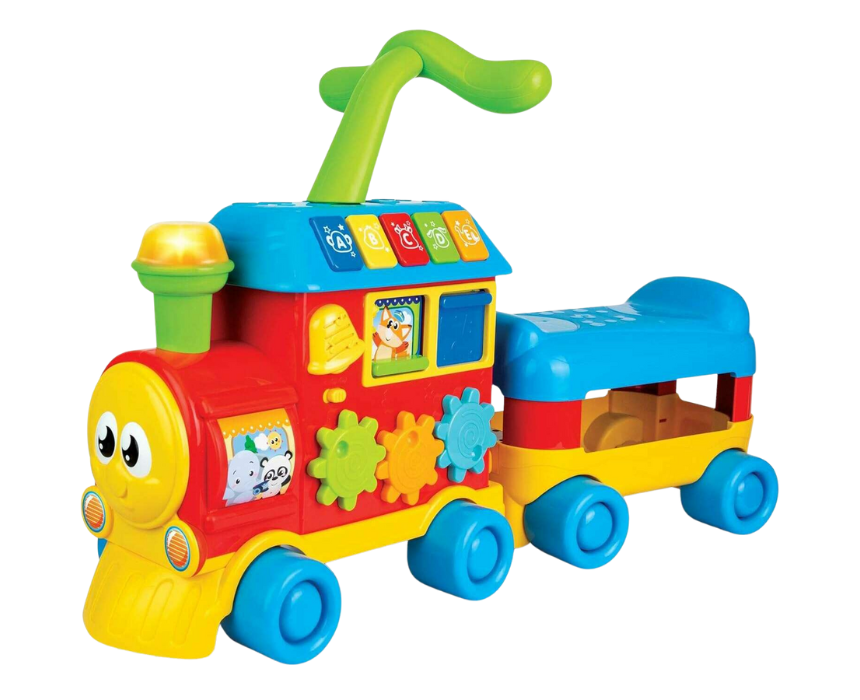 The Grow-With-Me Train offers three levels of play: interactive floor play, a push-around walker with an easy-grip handle, and a ride-on mode with an attachable trailer for storage. The light-up train engine teaches letters and colors, while fun phrases, sounds, cheerful melodies, and playful characters with moving gears keep children engaged. Perfect for developing early learning skills, coordination, and imaginative play.