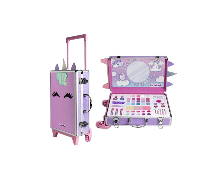 The Martinelia Unicorn Suitcase Children’s Make-Up Set is a fun and portable beauty kit for young makeup enthusiasts. Featuring 2 nail polishes, 13 lip glosses, 4 lip balm rings, 20 eye shadows, 3 blushes, hair tie, applicators, brushes, nail file, and finger separators, it comes in a colorful trolley case measuring 11.7 x 25 x 38 cm. Perfect for creative play at home or on the go, it encourages imaginative styling and safe, kid-friendly beauty fun.