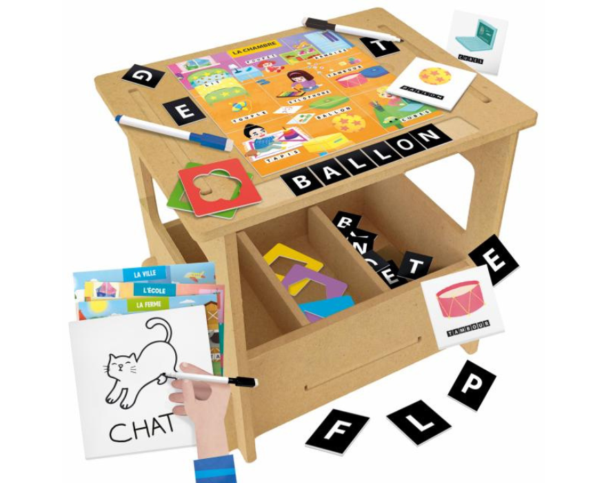 The Headu wooden writing desk is an educational learning station designed to help children develop early writing and language skills in both English and French through guided activities. It supports fine motor development, letter recognition, and cognitive learning while offering an engaging hands on experience that encourages independent study and creative exploration.