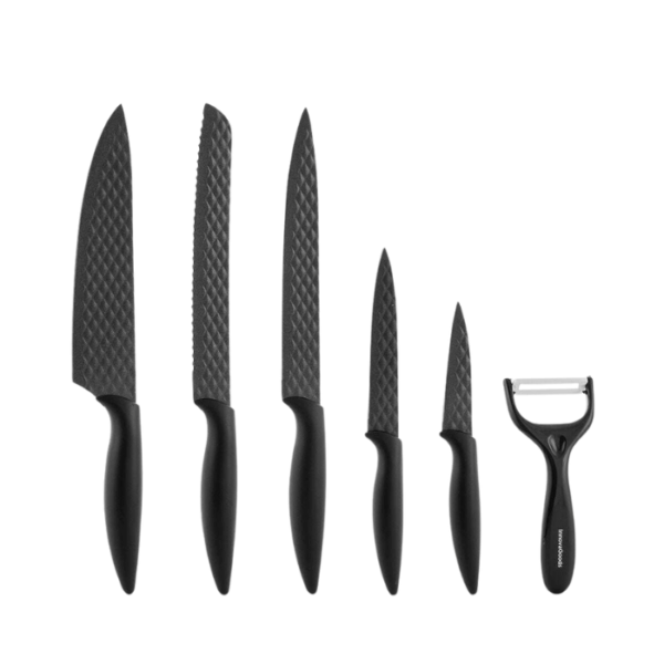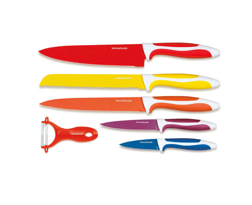 The InnovaGoods Knoolvs 6-Piece Ceramic Knife Set combines style, precision, and safety for effortless kitchen prep. Featuring non-stick ceramic-coated blades, ergonomic non-slip handles, and a magnetised presentation case, this set includes a peeler, kitchen knife, bread knife, meat knife, general knife, and peeler knife for versatile cutting tasks. Durable, colorful, and easy to handle, it is perfect for home chefs or as a thoughtful gift for cooking enthusiasts.