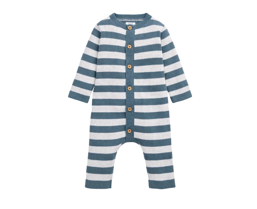 The Knit Stripe Romper is a stylish and comfortable outfit for little ones, perfect for easy dressing and everyday wear. Featuring a soft petrol blue and oatmeal stripe pattern, ribbed collar, cuffs, and hems, and a front button fastening for convenience. Pair with soft booties or layered under a cardigan for a cozy, versatile look.