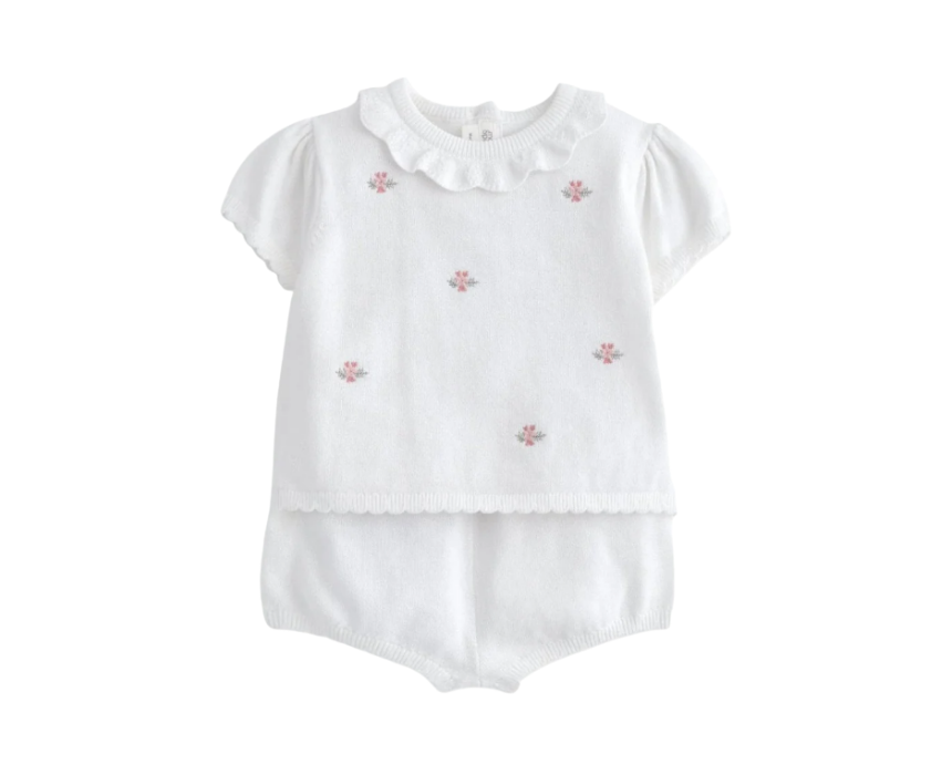 This Embroidered Knit Top and Shorts Set in white is a refined two-piece outfit designed for dressier days. The knitted top features delicate floral embroidery, a ribbed neckline, moss stitch scalloped detailing, and a back-button opening, paired with matching shorts with an elasticated rib waistband and scalloped edge finish. Style it with soft sandals or ballet flats and a lightweight cardigan for an elegant warm-weather look.
